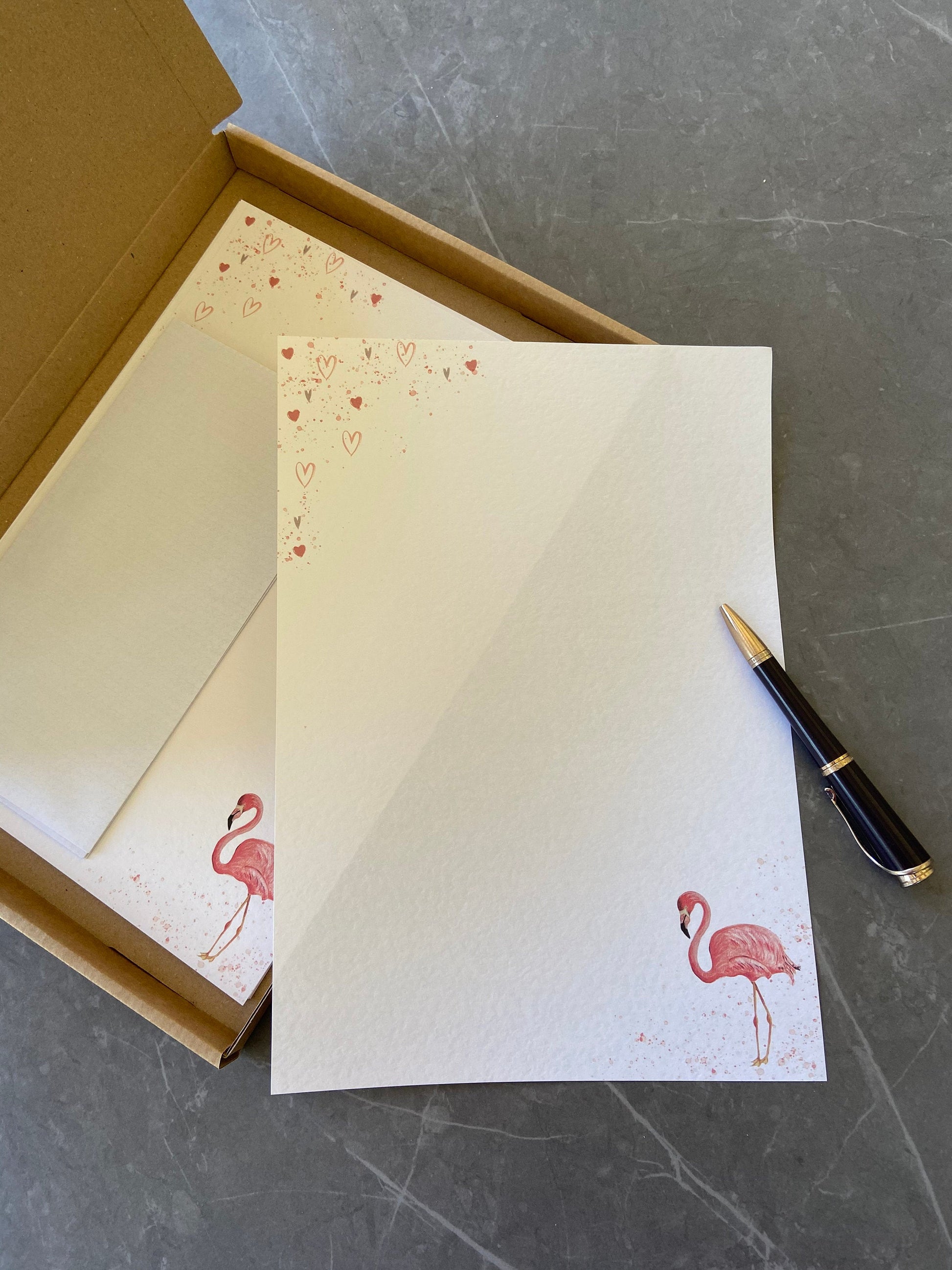 This pretty writing paper is A4 sized for when you want something larger to write your letters on. Its flamingo and heart design sits in the bottom right hand corner and top left hand corner. The paper is beautifully textured giving it a luxurious feel, and is FSC approved.