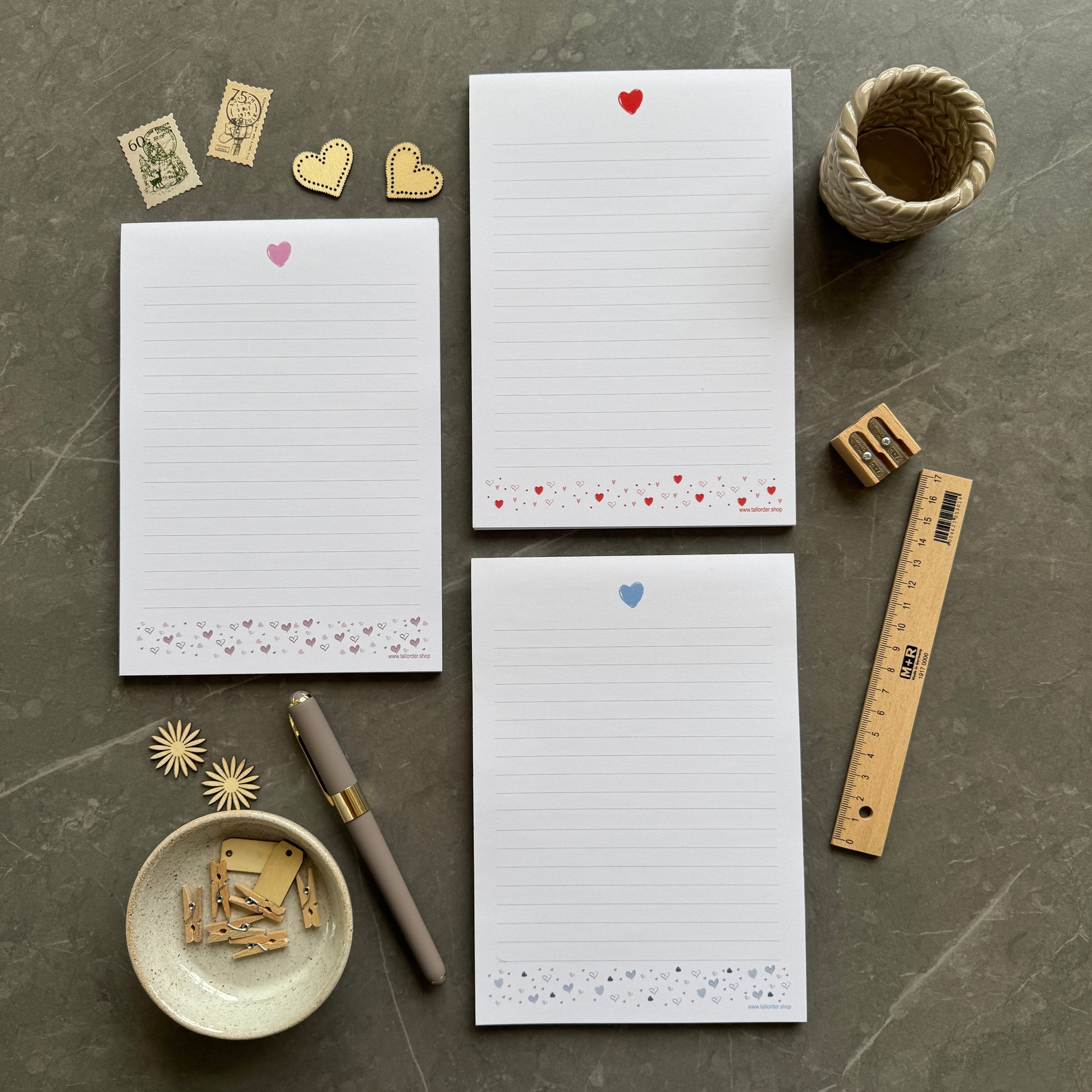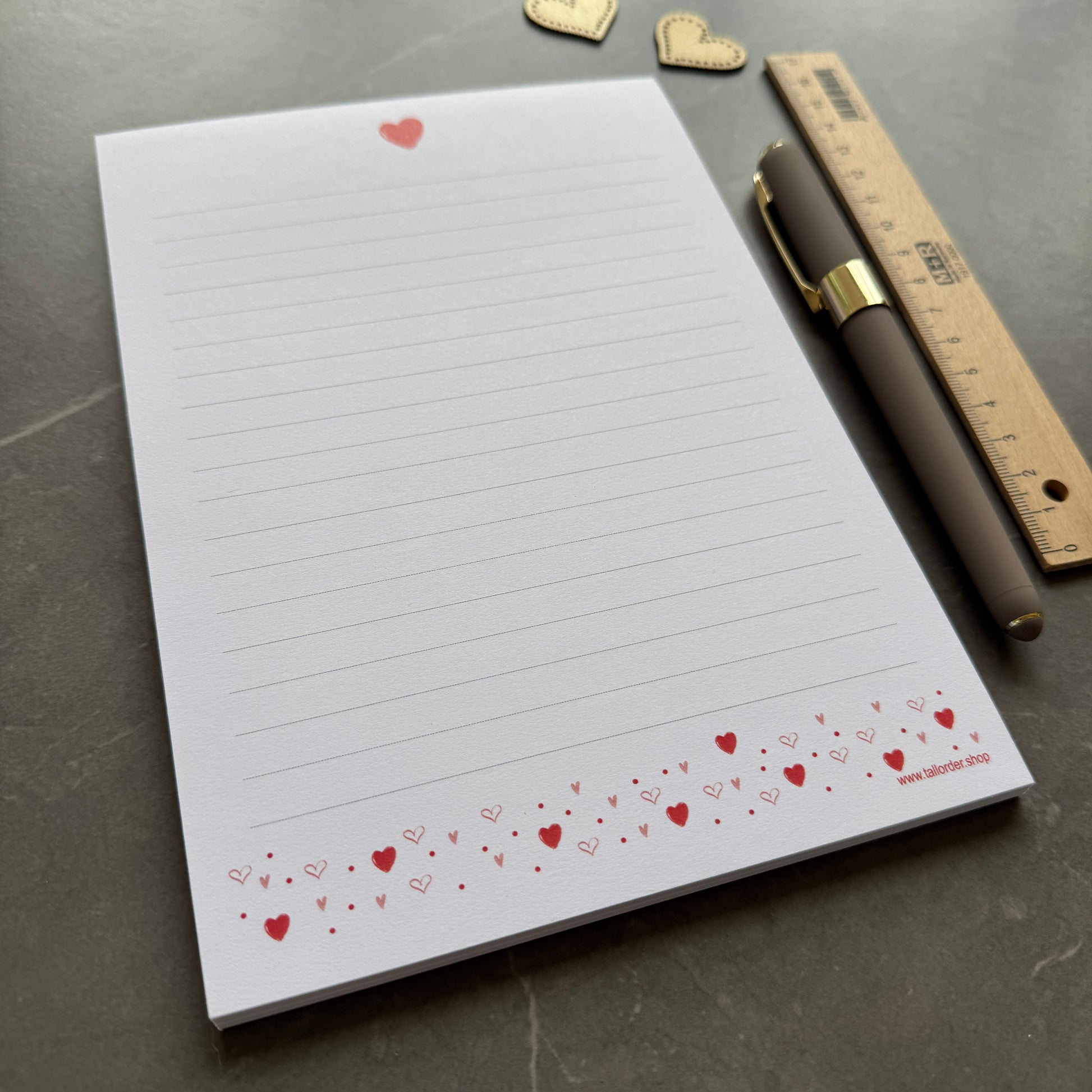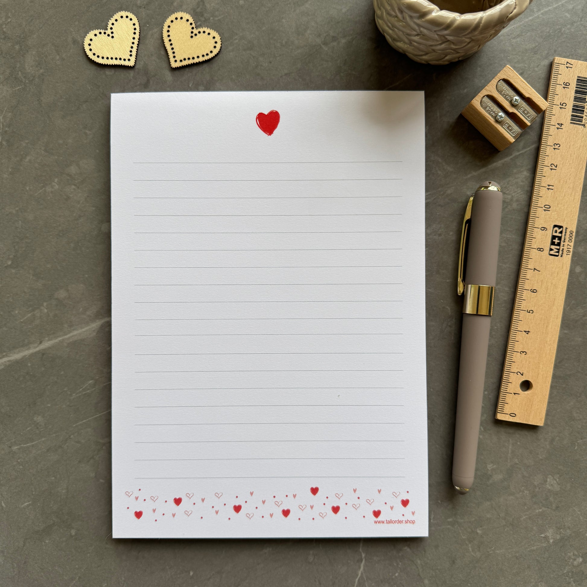 This sweet notepad is super versatile. Use it for making notes at home or on the go. Write letters to loved ones or friends. The pretty heart pattern is scattered along the bottom with a single love heart at the top.