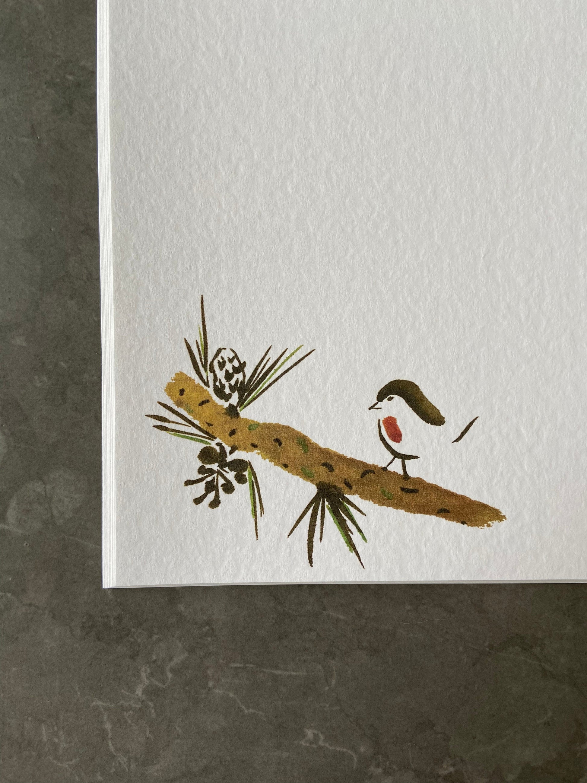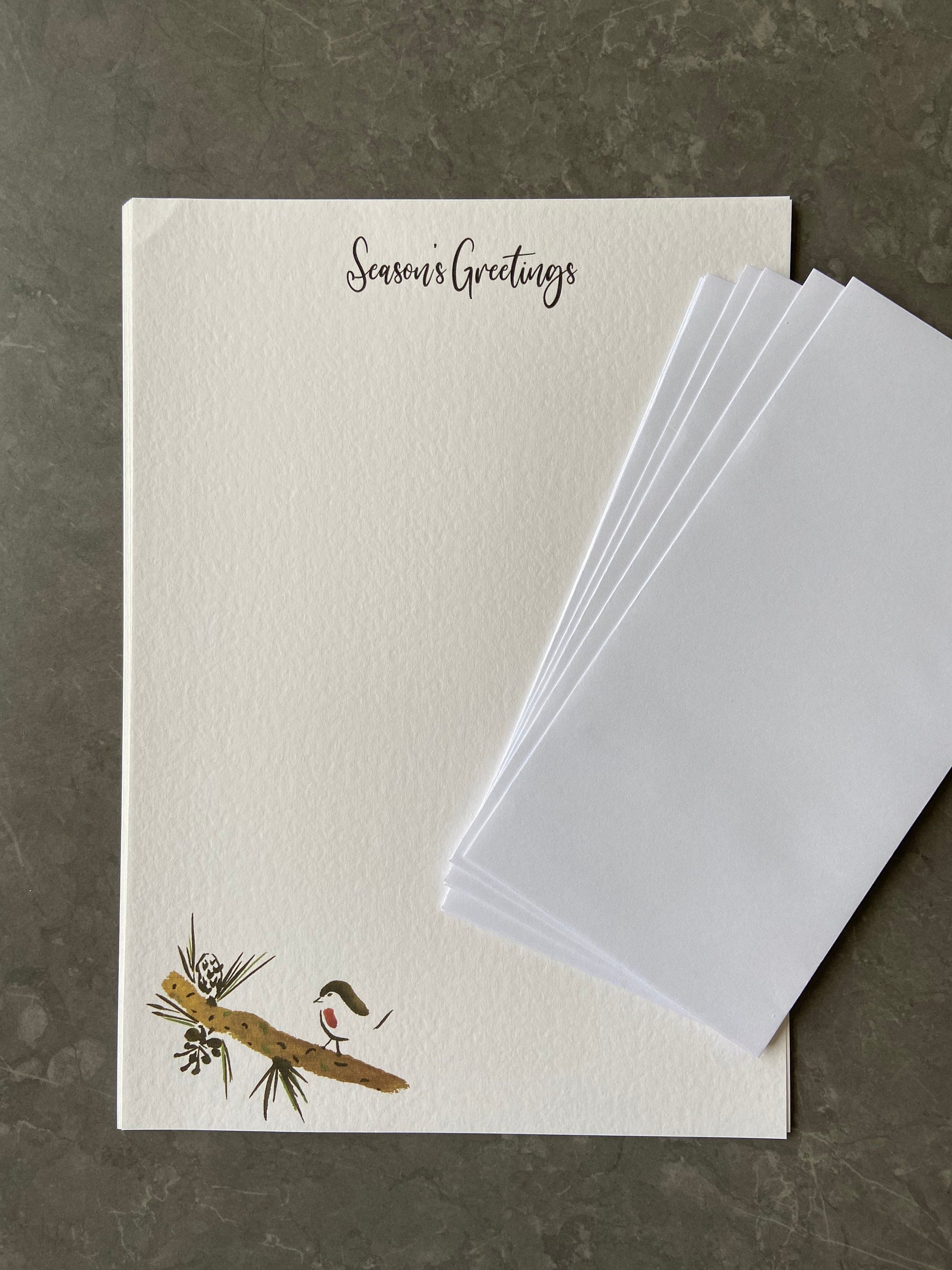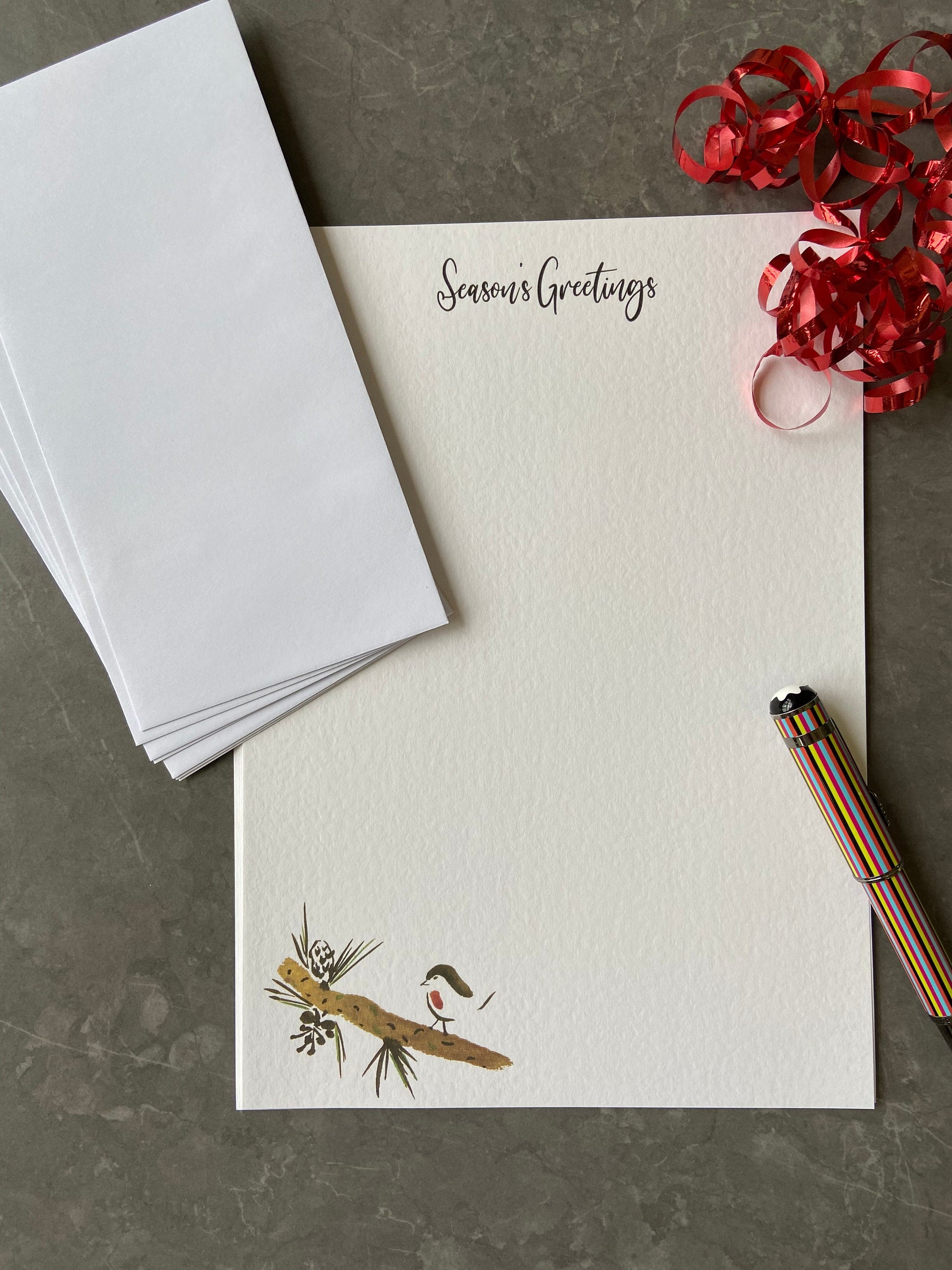 This pretty writing paper is Christmas themed and perfect for sending Christmas and Seasonal greetings, as is the tradition at this special time of year. It has a simple Chinese brush painted robin in the bottom left hand corner and "Seasonal Greetings" printed across the top.