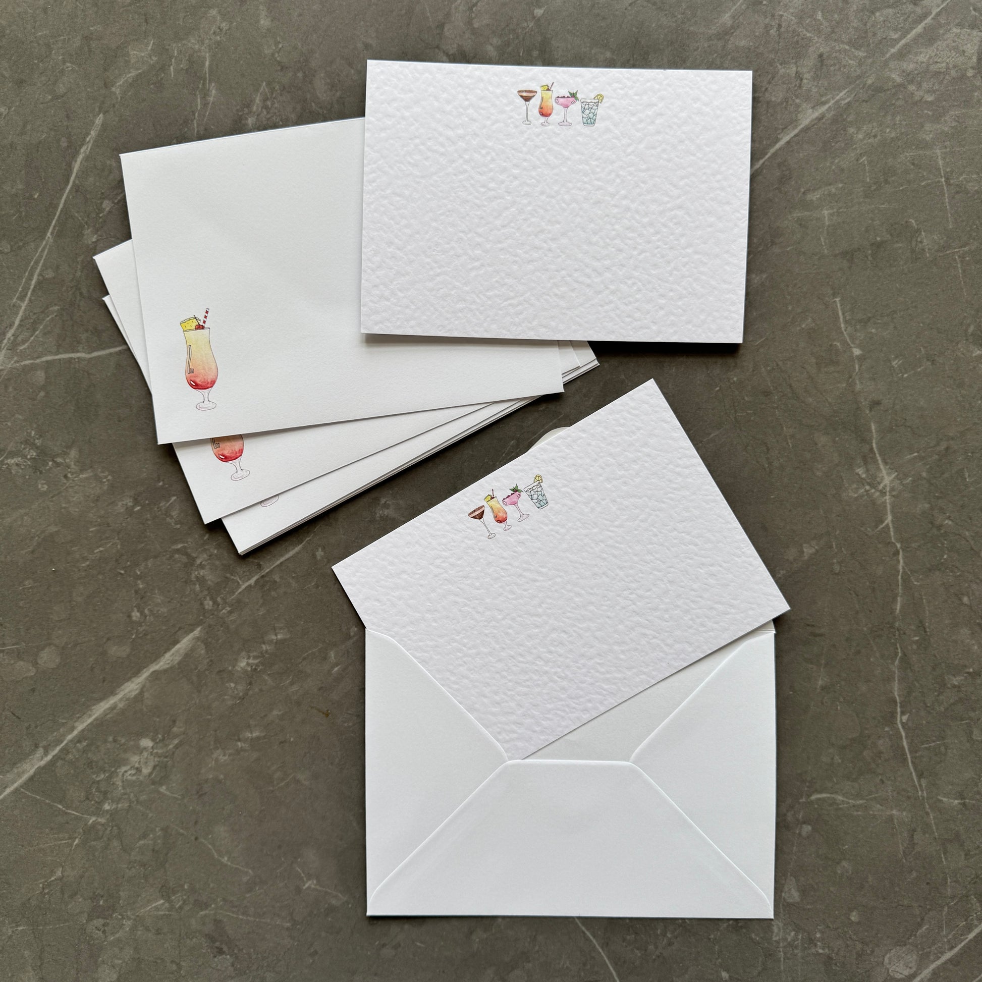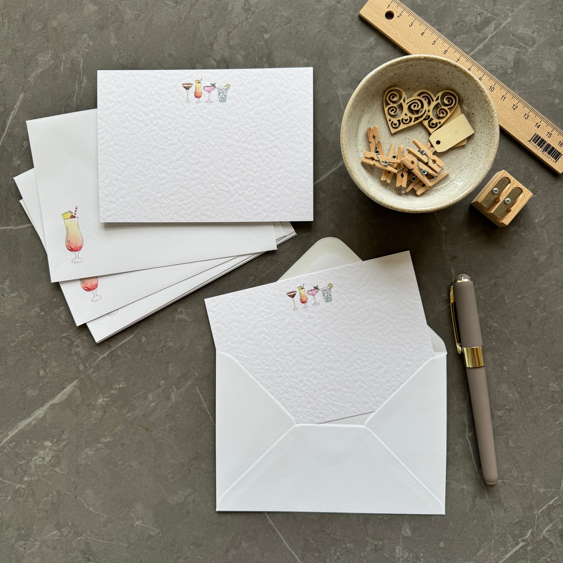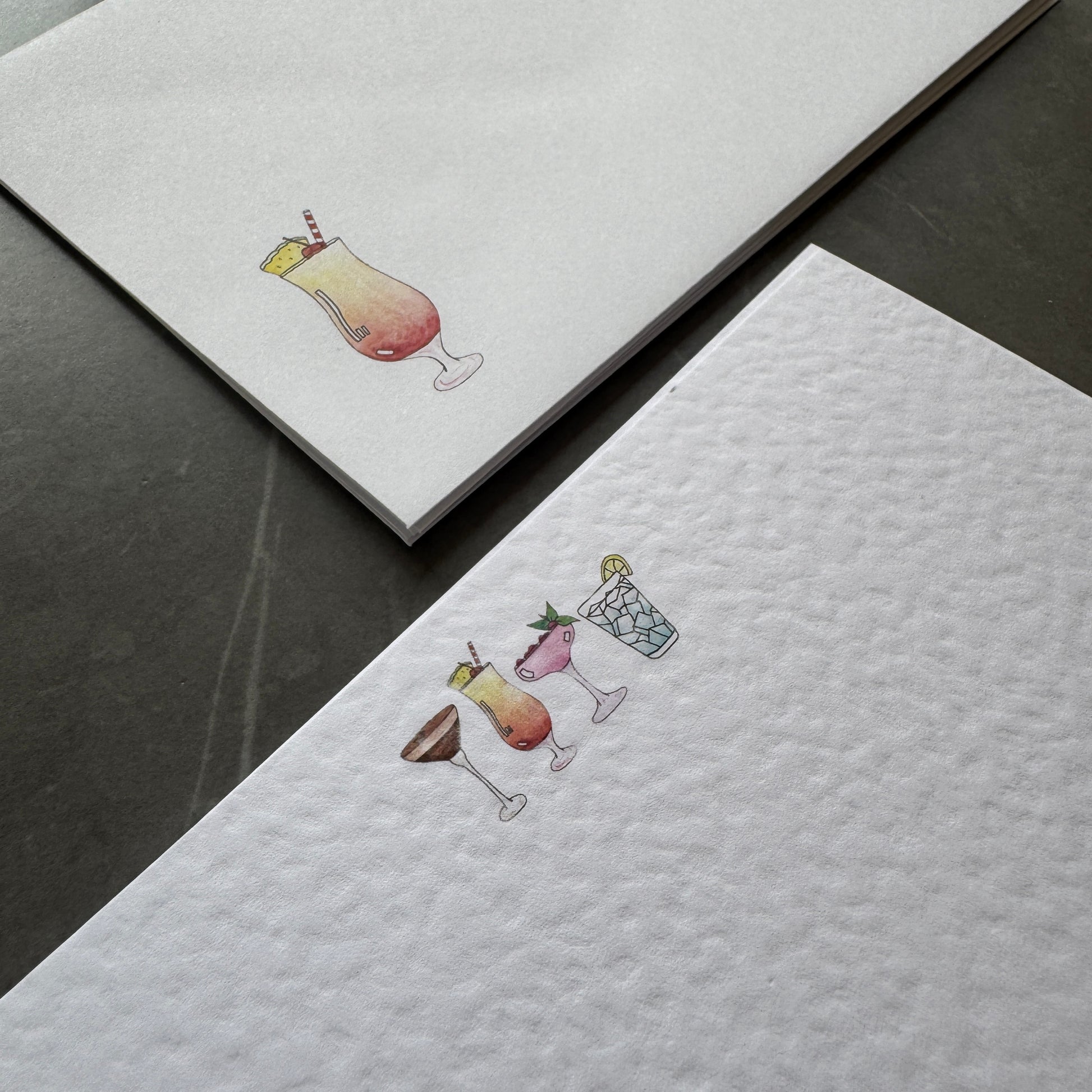 Each set contains 10 white postcards that are A6 in size with a colourful line of cocktails, an original design by Tall Order. The card is a medium thickness textured white card. Every card has its own white envelope with an orange cocktail printed in the bottom corner.