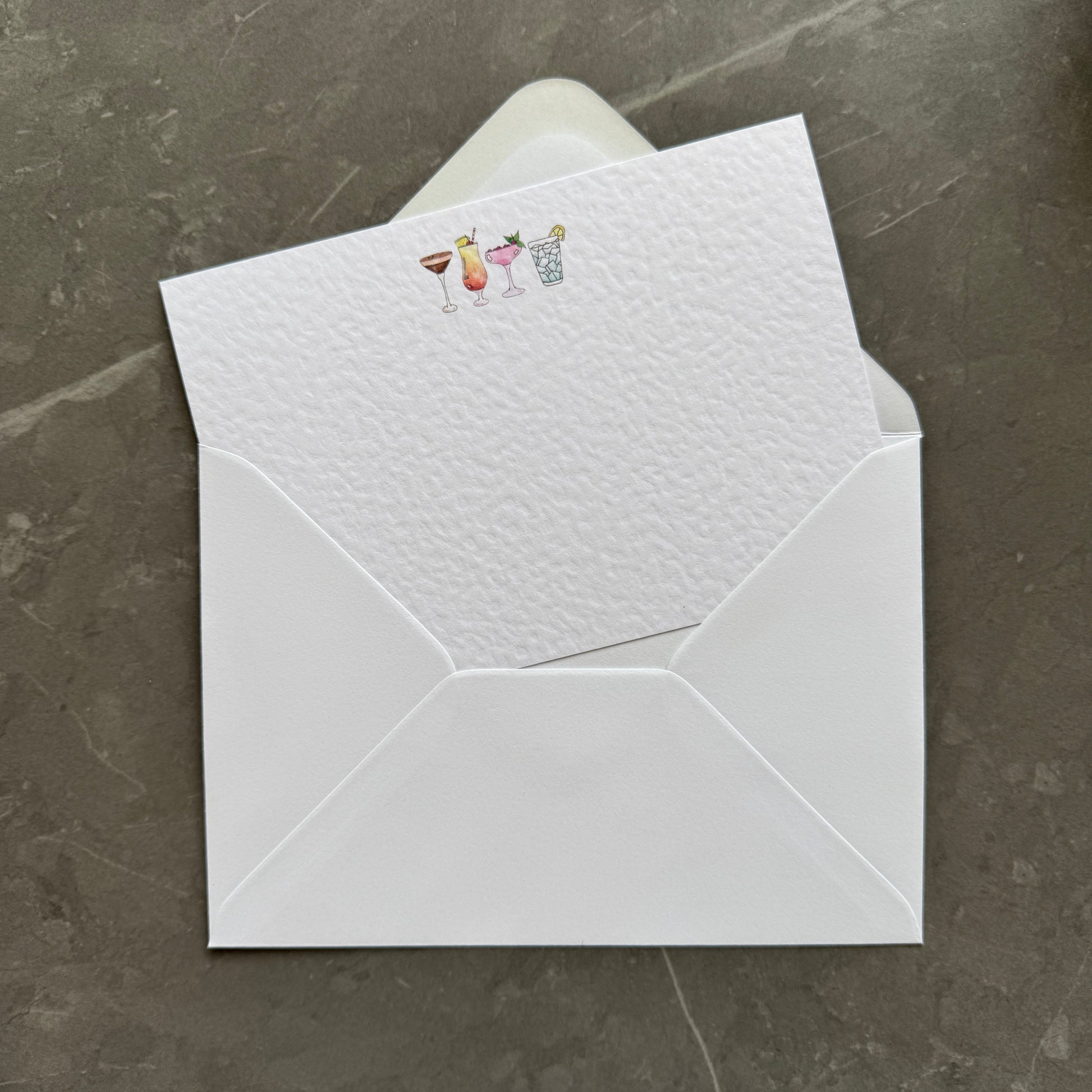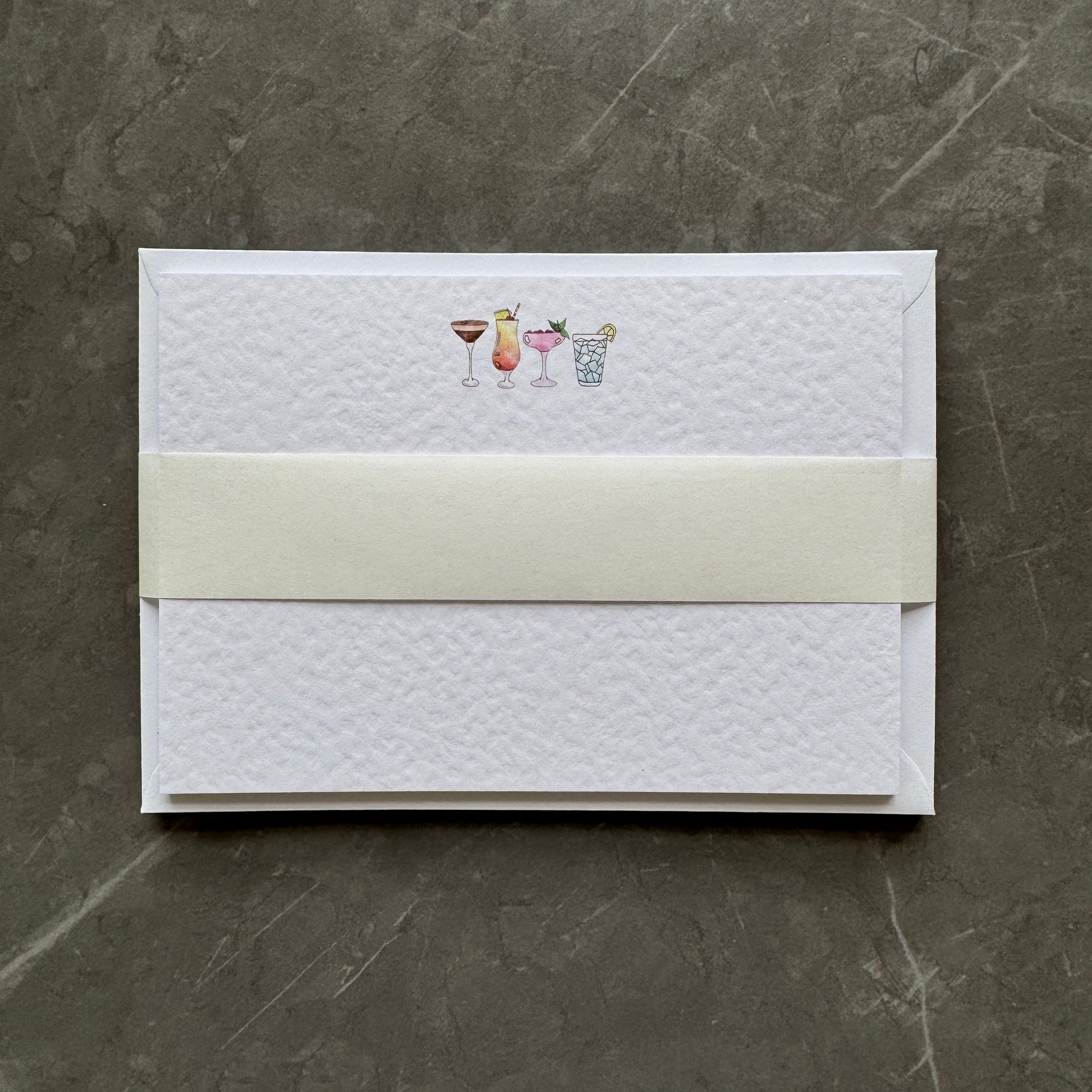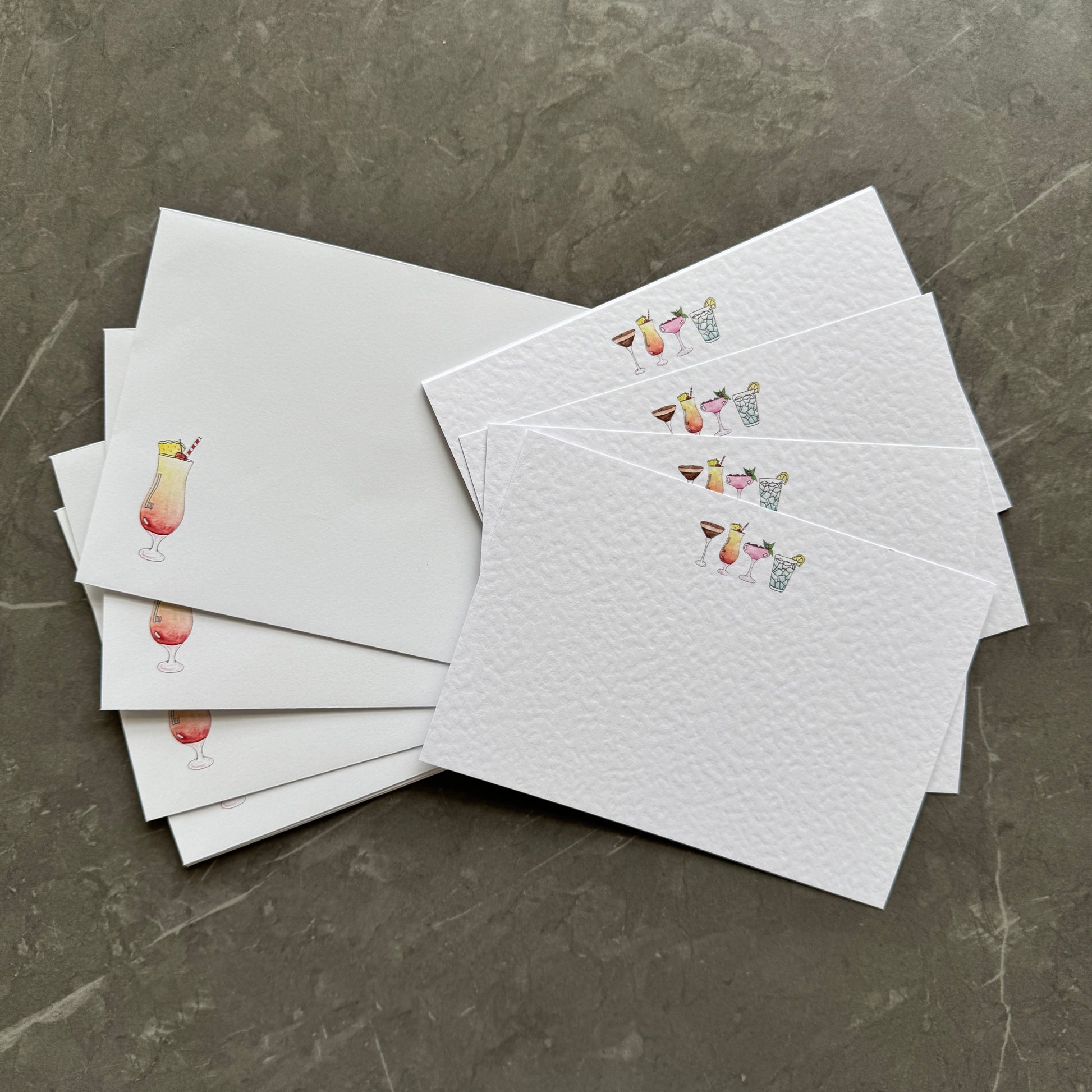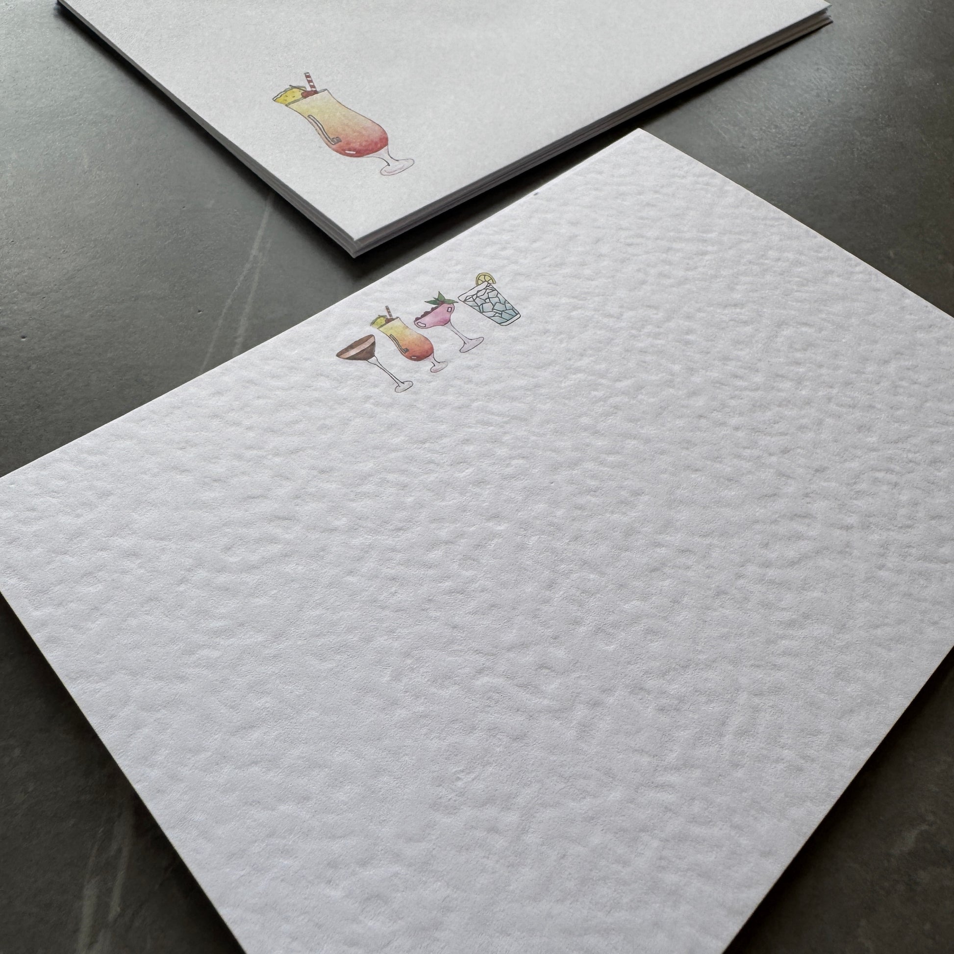 Each set contains 10 white postcards that are A6 in size with a colourful line of cocktails, an original design by Tall Order. The card is a medium thickness textured white card. Every card has its own white envelope with an orange cocktail printed in the bottom corner.