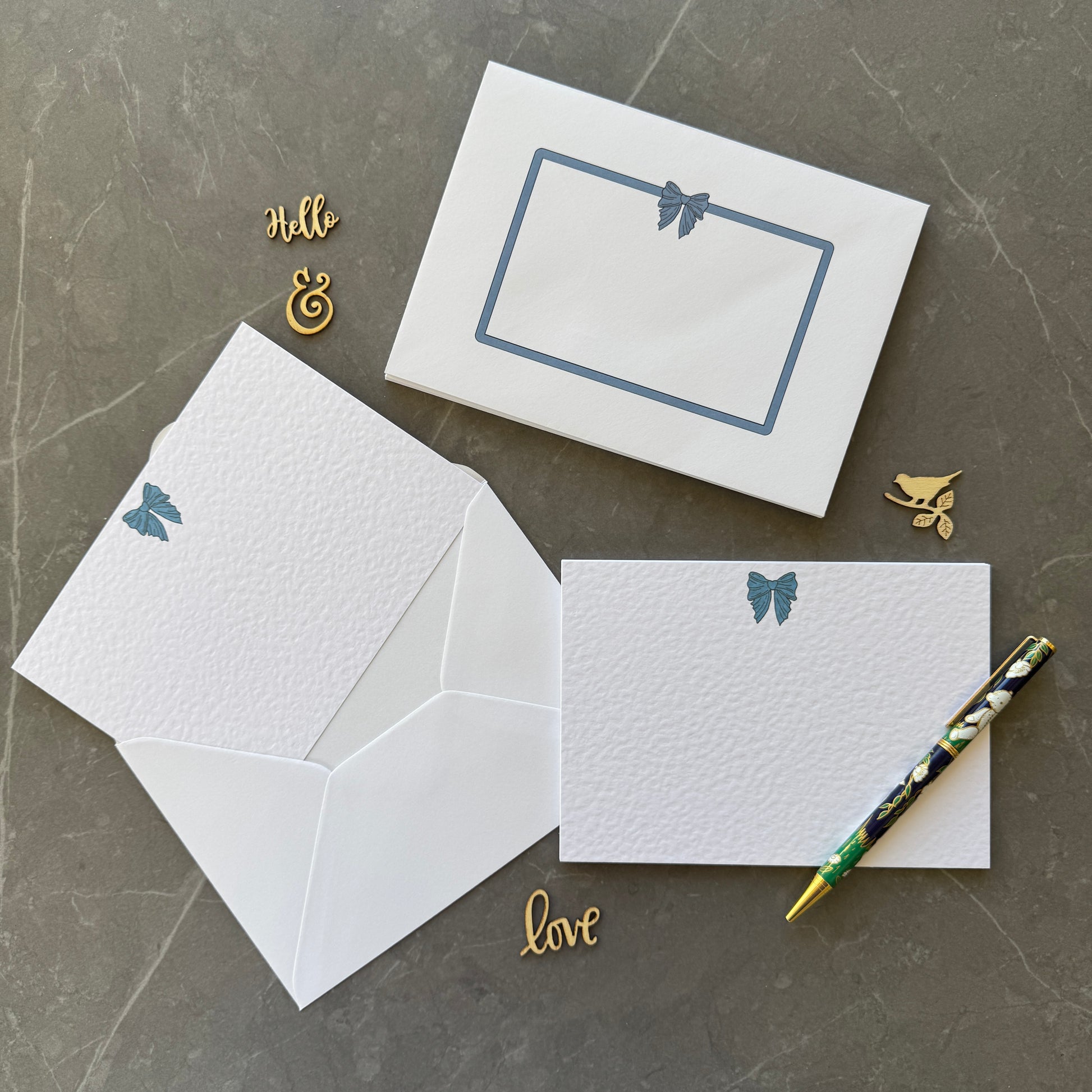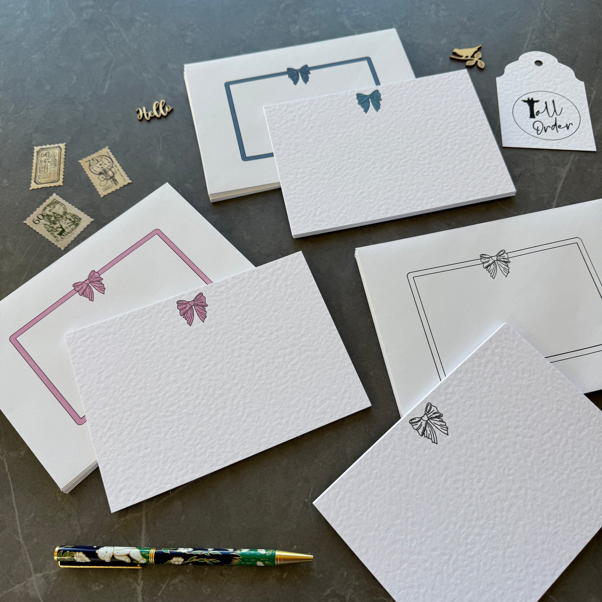 Each set contains white postcards that are A6 in size with a gorgeous little coquette bow illustration at the top. Choose from a blue bow, pink bow or simple white bow. The card is a medium thickness textured white card. Every card has its own white envelope with a bow illustrated address box.