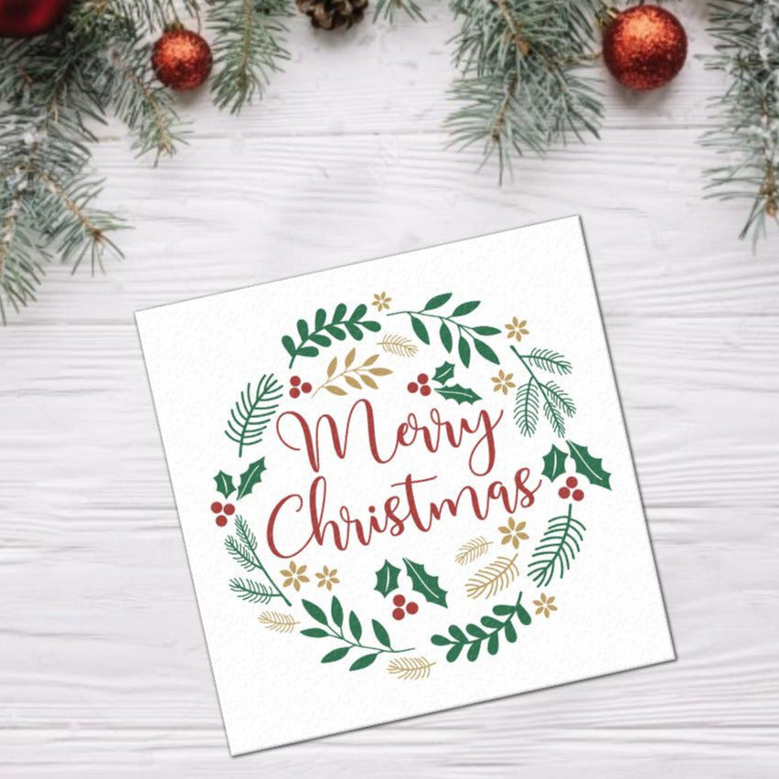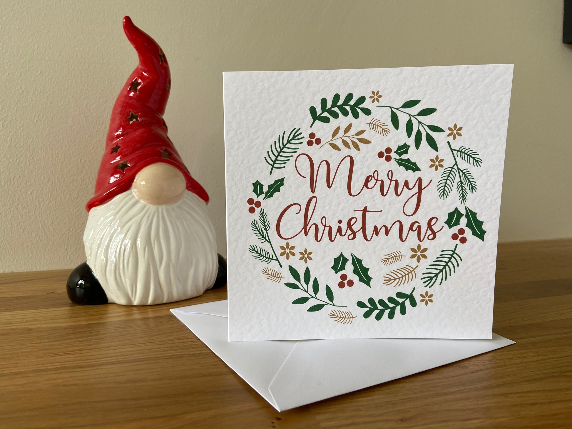 This beautiful Christmas card pictures a modern wreath in Christmas colours with "Merry Christmas" written across the centre.