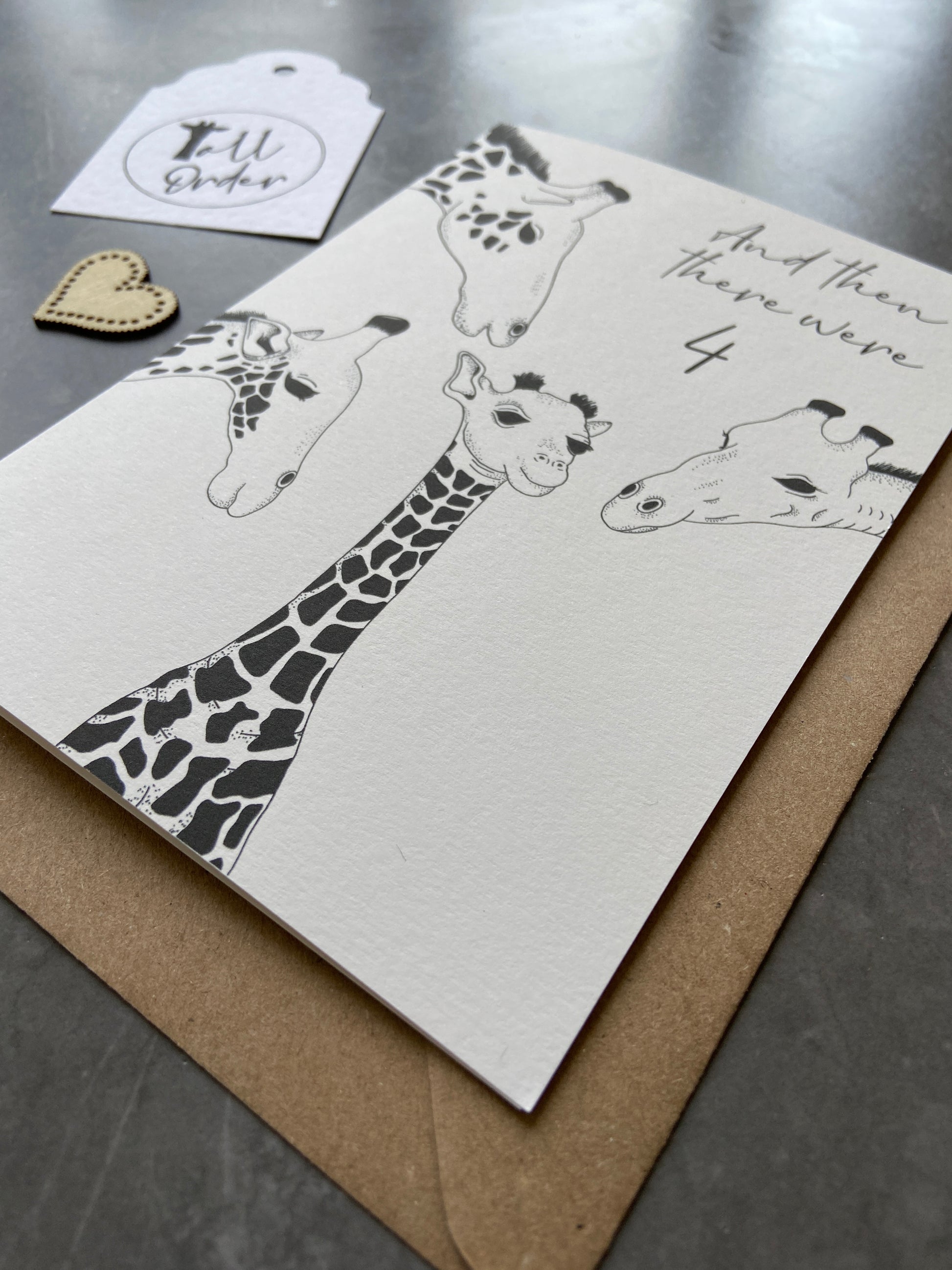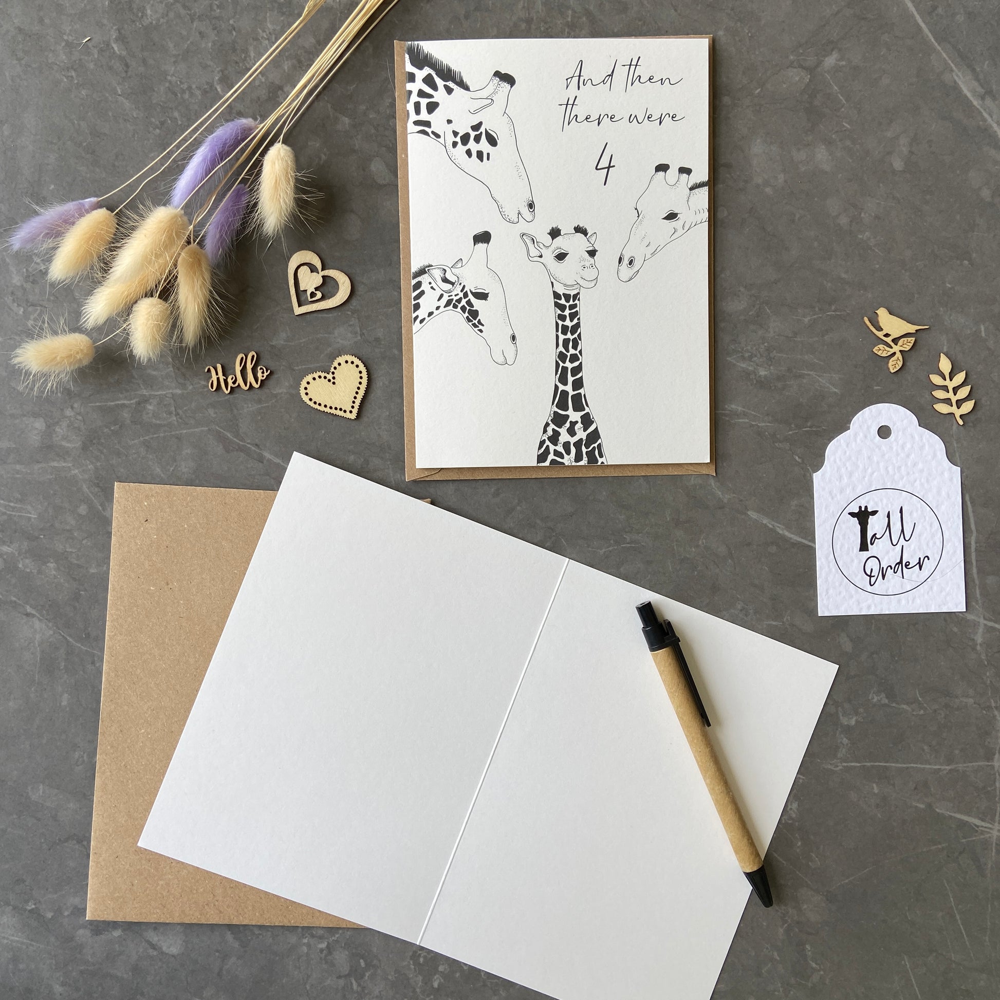 This adorable card depicts a family of 4 giraffes celebrating the arrival of a second baby.