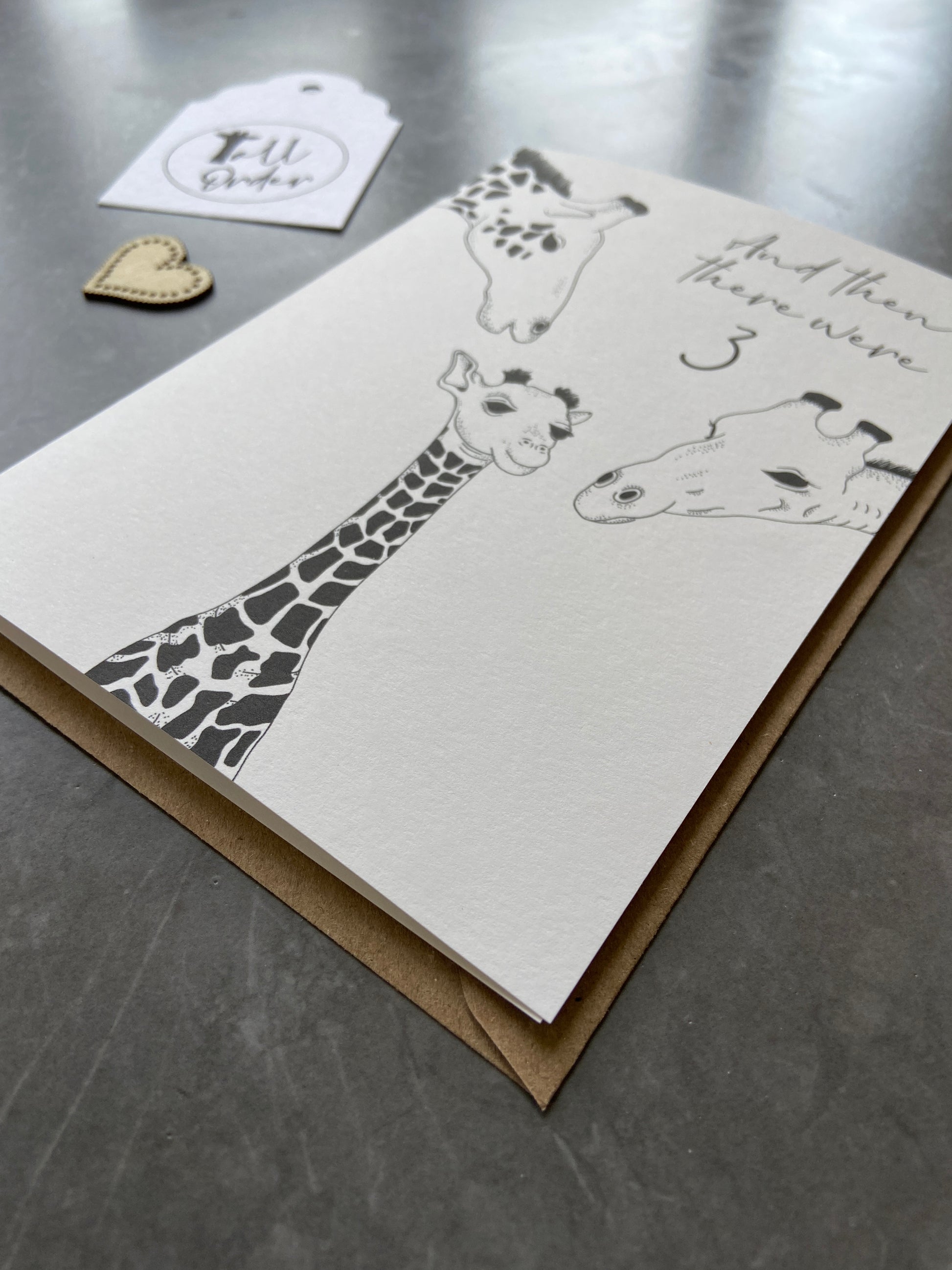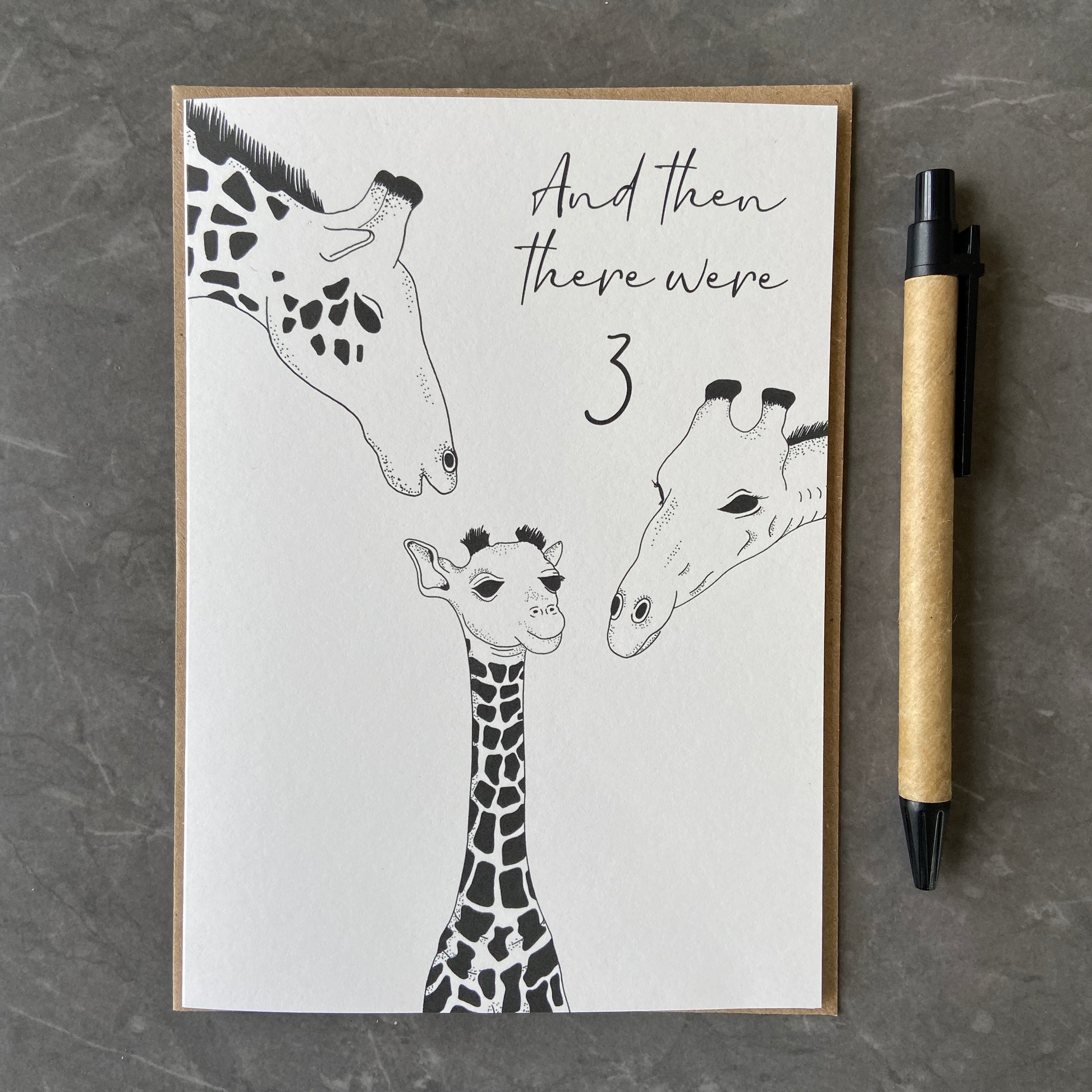 This is a cute card of congratulations to new parents making a family of three. The card depicts the new baby giraffe and the happy parents.