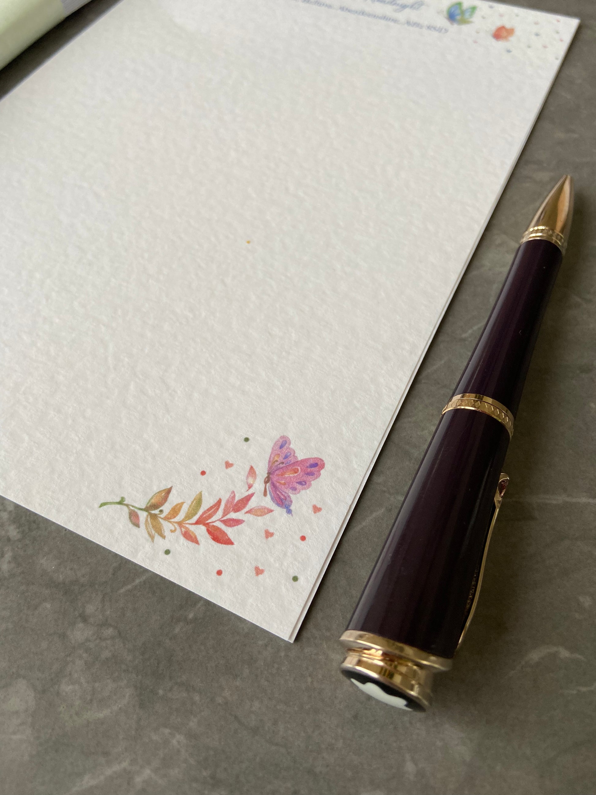 This luxury hammer textured writing paper is offered in sets of 10, 20 or 30. Include your name in this pretty hand written style heart font. You can also add your address printed underneath. The paper has a pretty butterfly and heart illustration across the top in subtle pastel shades.