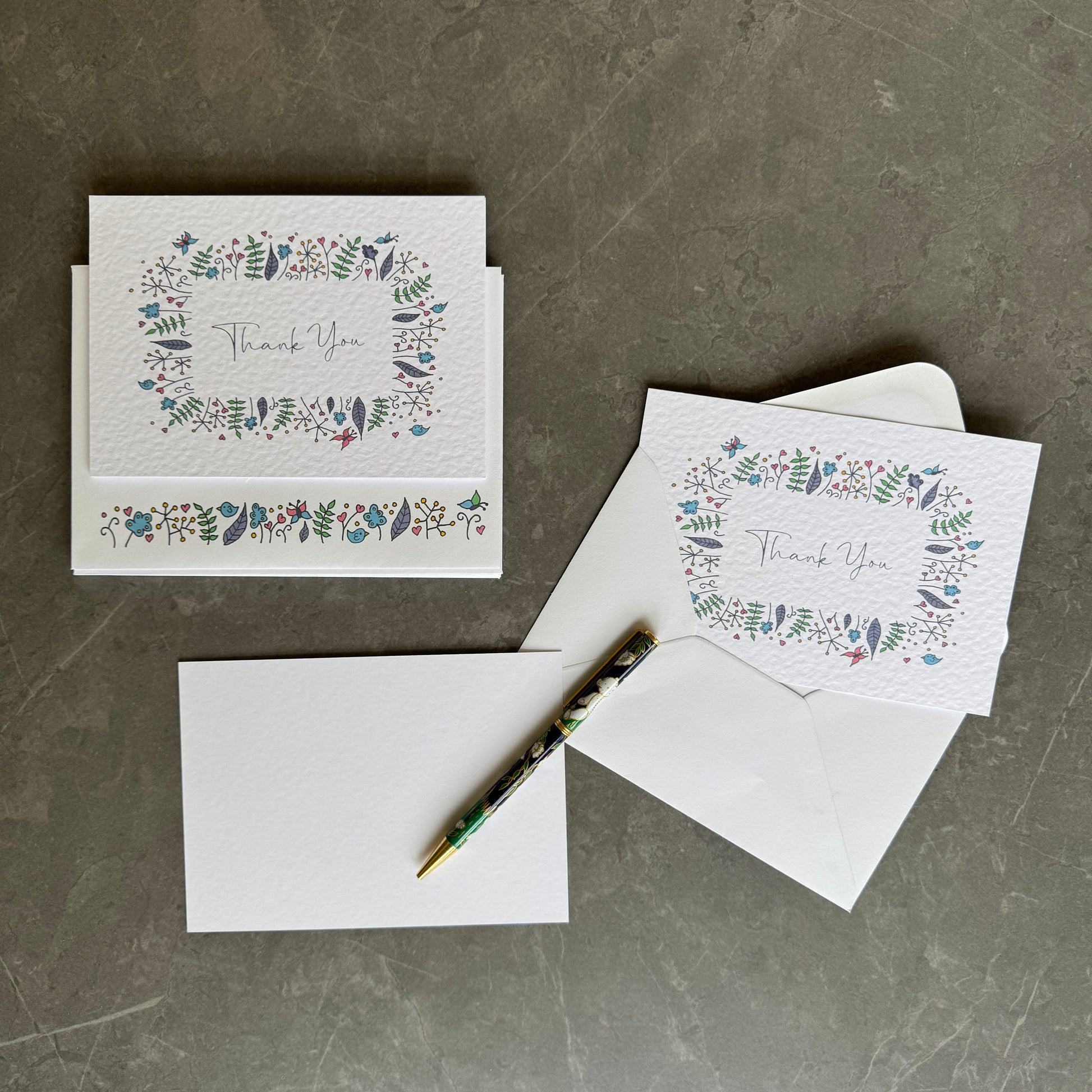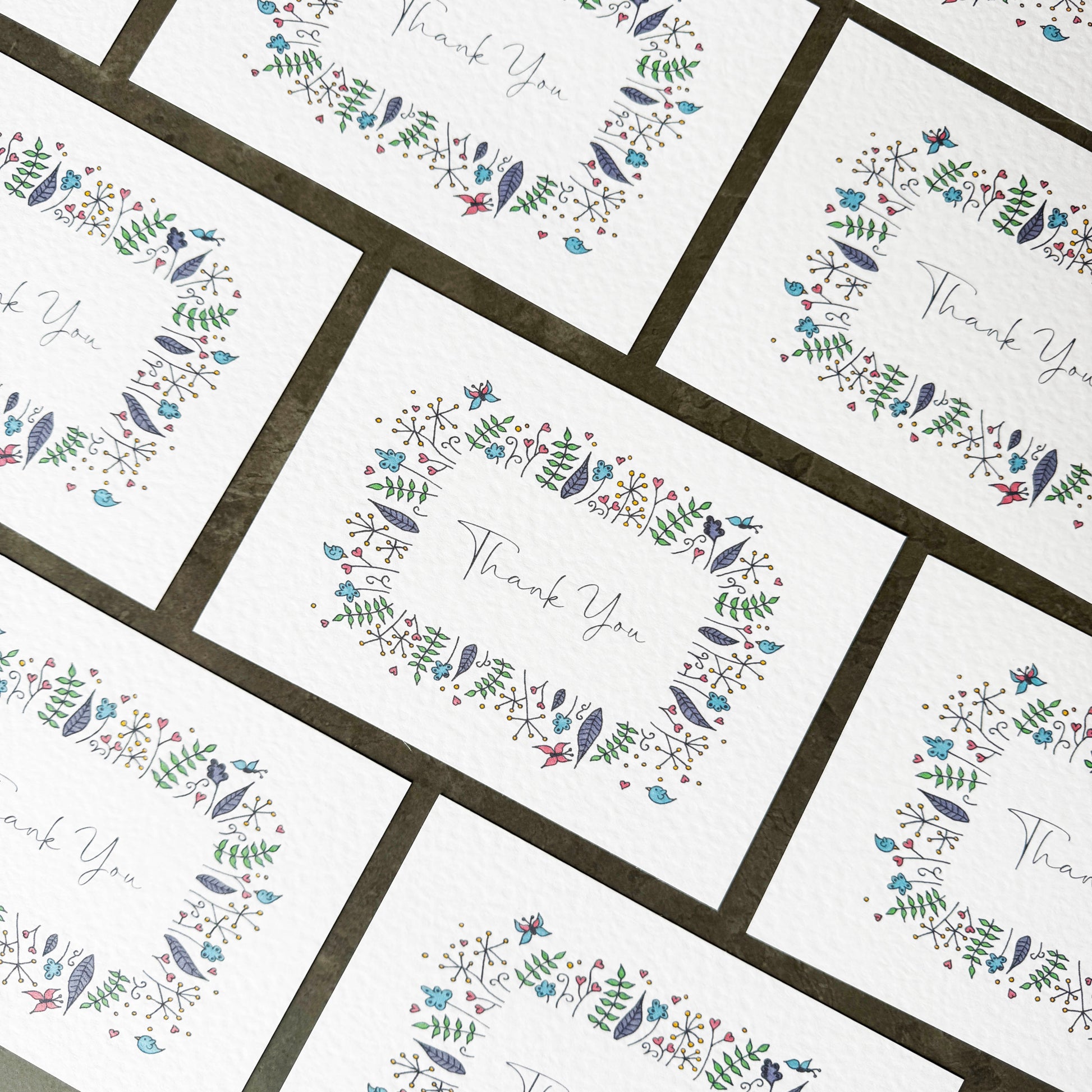 This is a set of pretty thank you note cards, or correspondence cards. The words "thank you" are surround by dainty florals, birds and butterflies and printed onto a softly textured white card.