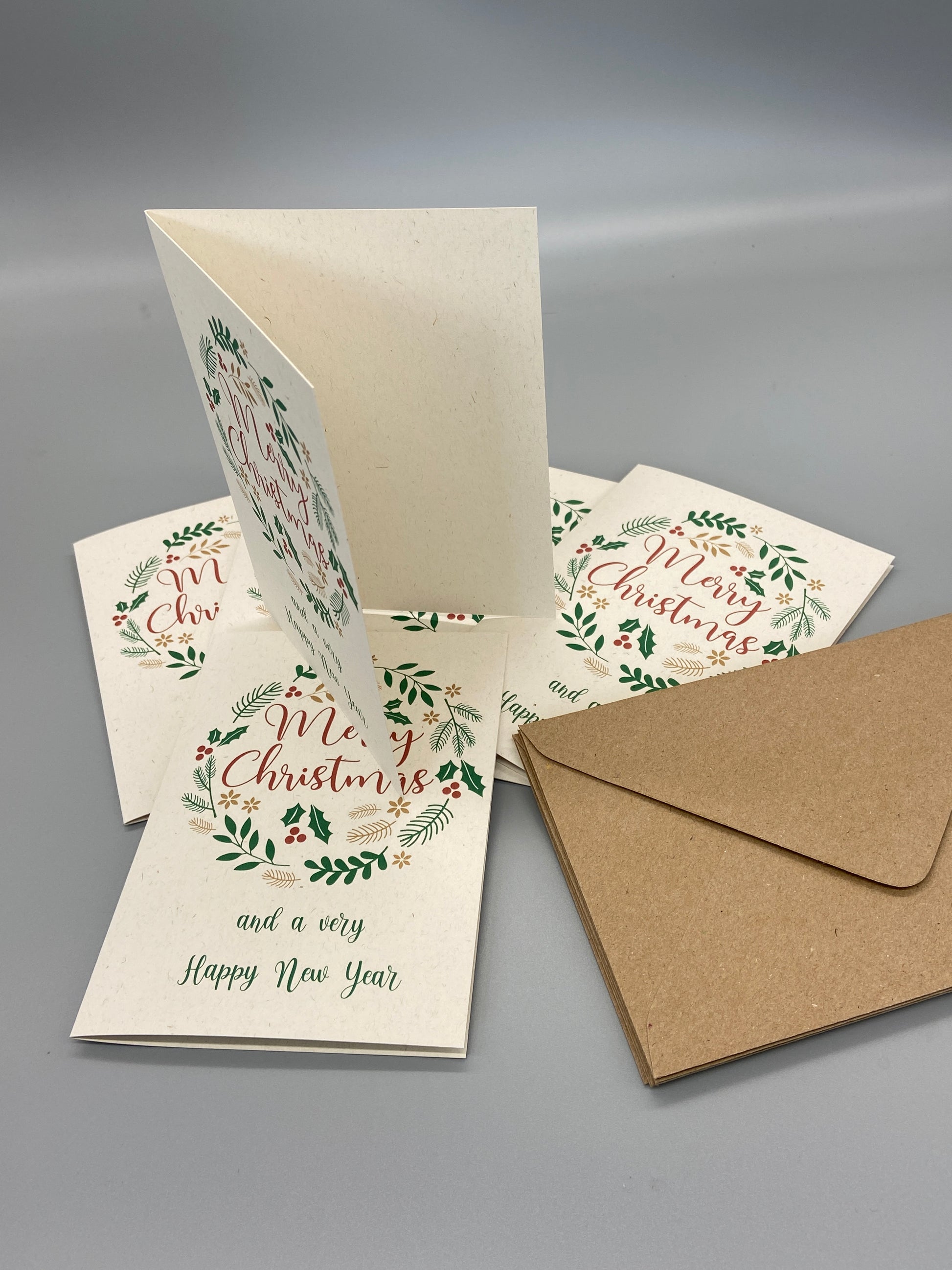 A set of 8 contemporary Christmas cards printed on recycled ivory eco fleck card. The words "Merry Christmas" are encircled with a modern Scandi style wreath illustration. An environmentally conscious alternative to standard Christmas cards with no compromise on quality or design.